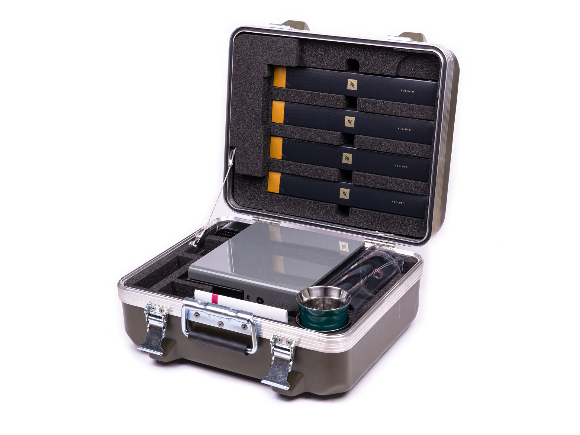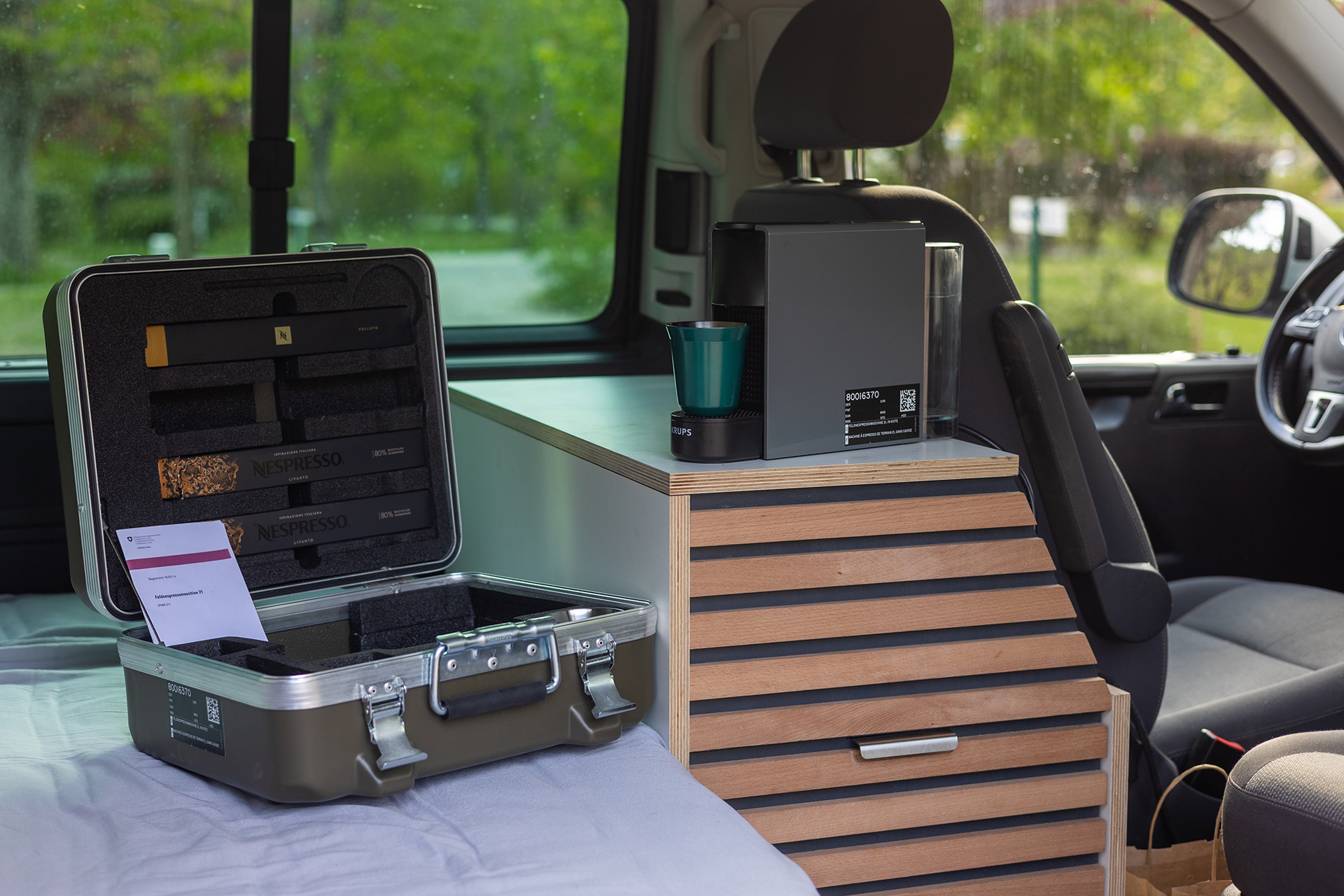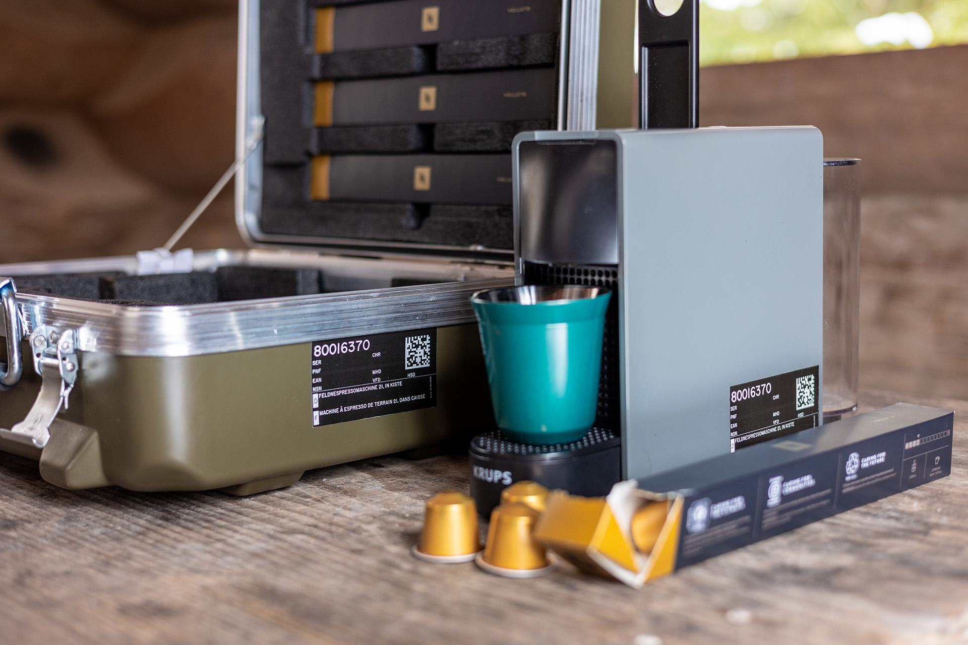 Herzstück des Koffers ist die Krups Essenza Mini C30 Kaffemaschine. Dank den kompakten Abmessungen bleibt das ganze System handlich.