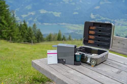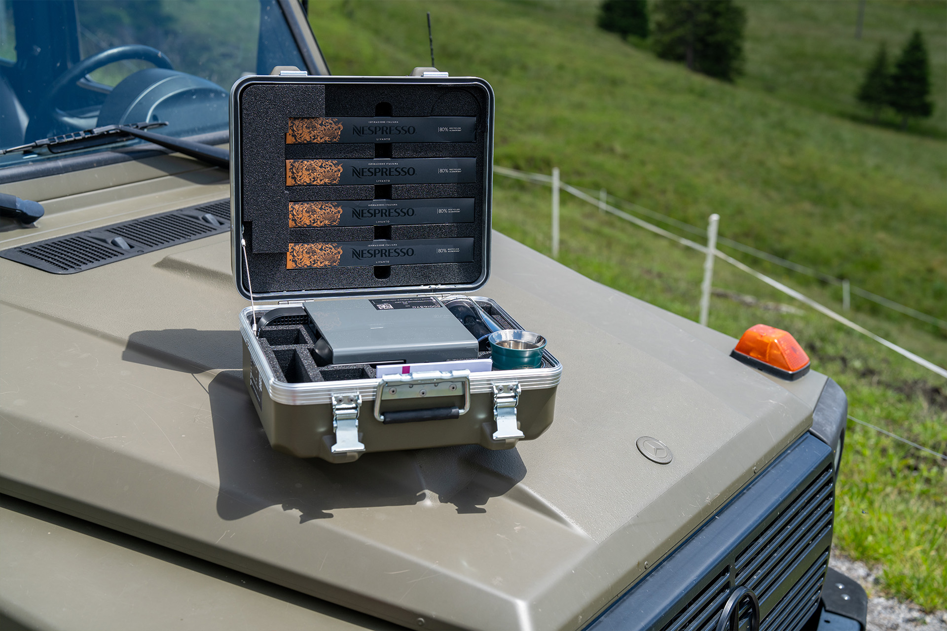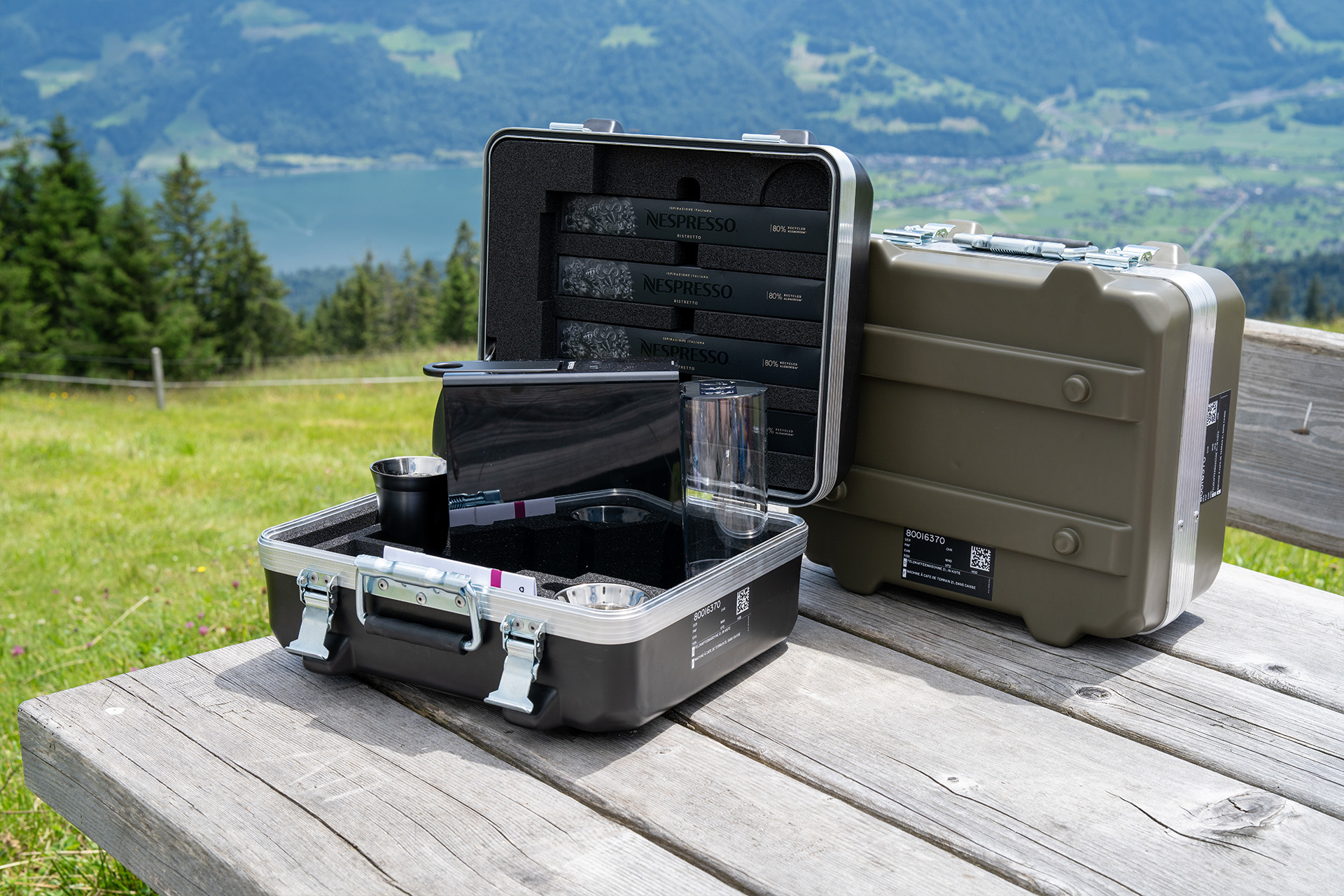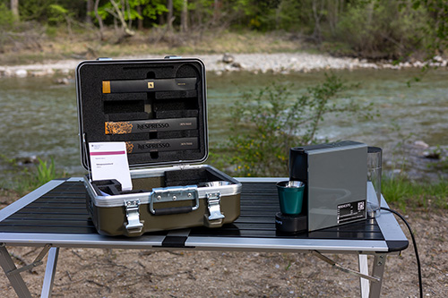 Herzstück des Koffers ist die Krups Essenza Mini C30 Kaffemaschine. Dank den kompakten Abmessungen bleibt das ganze System handlich.