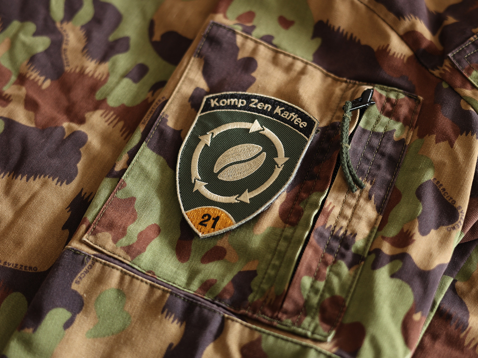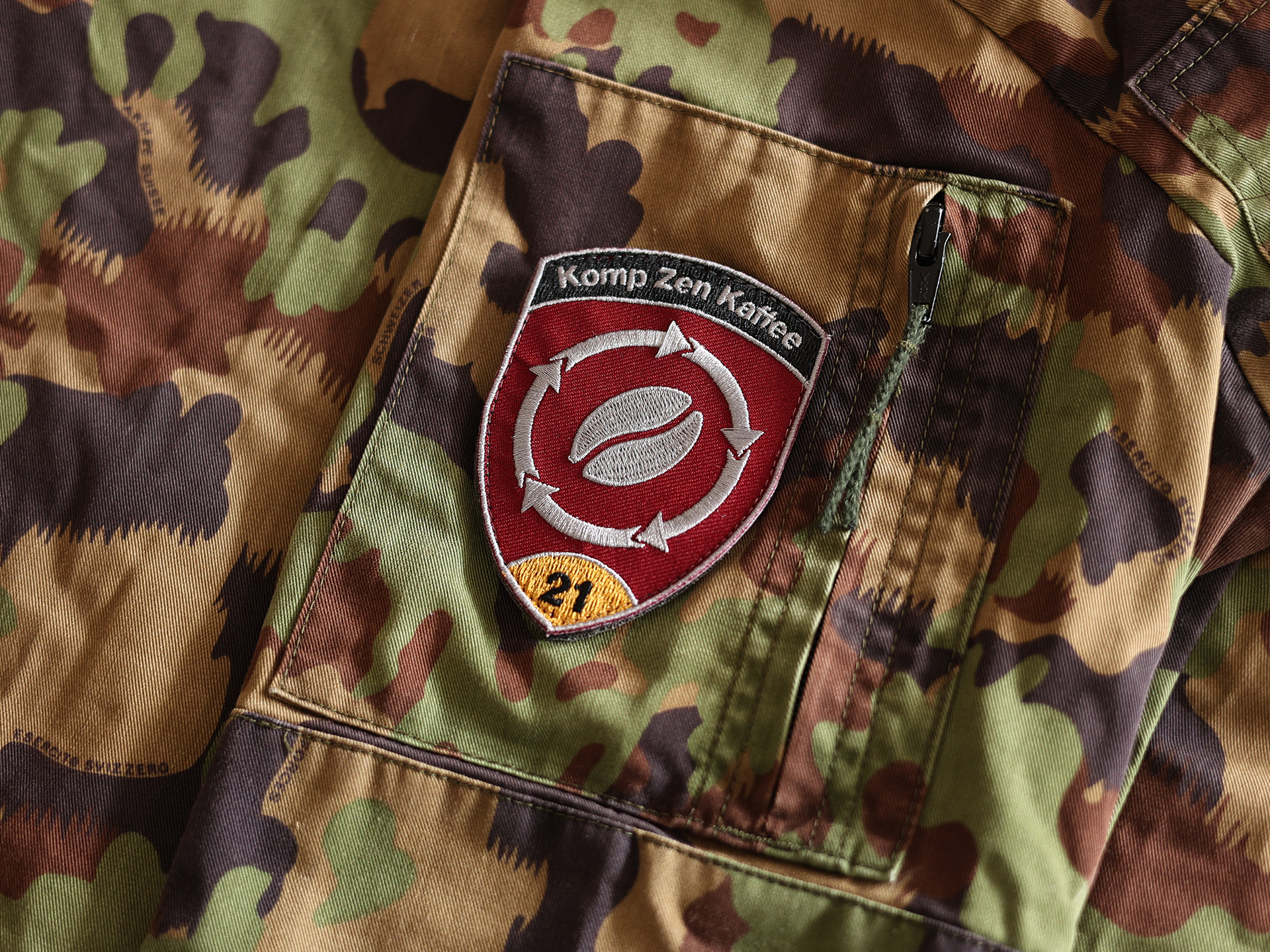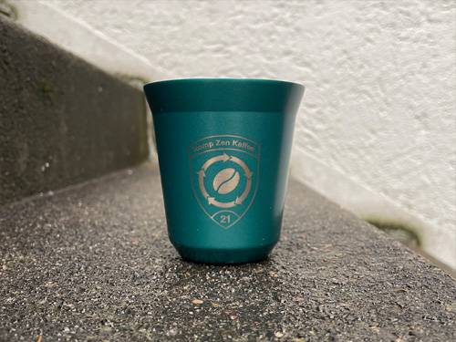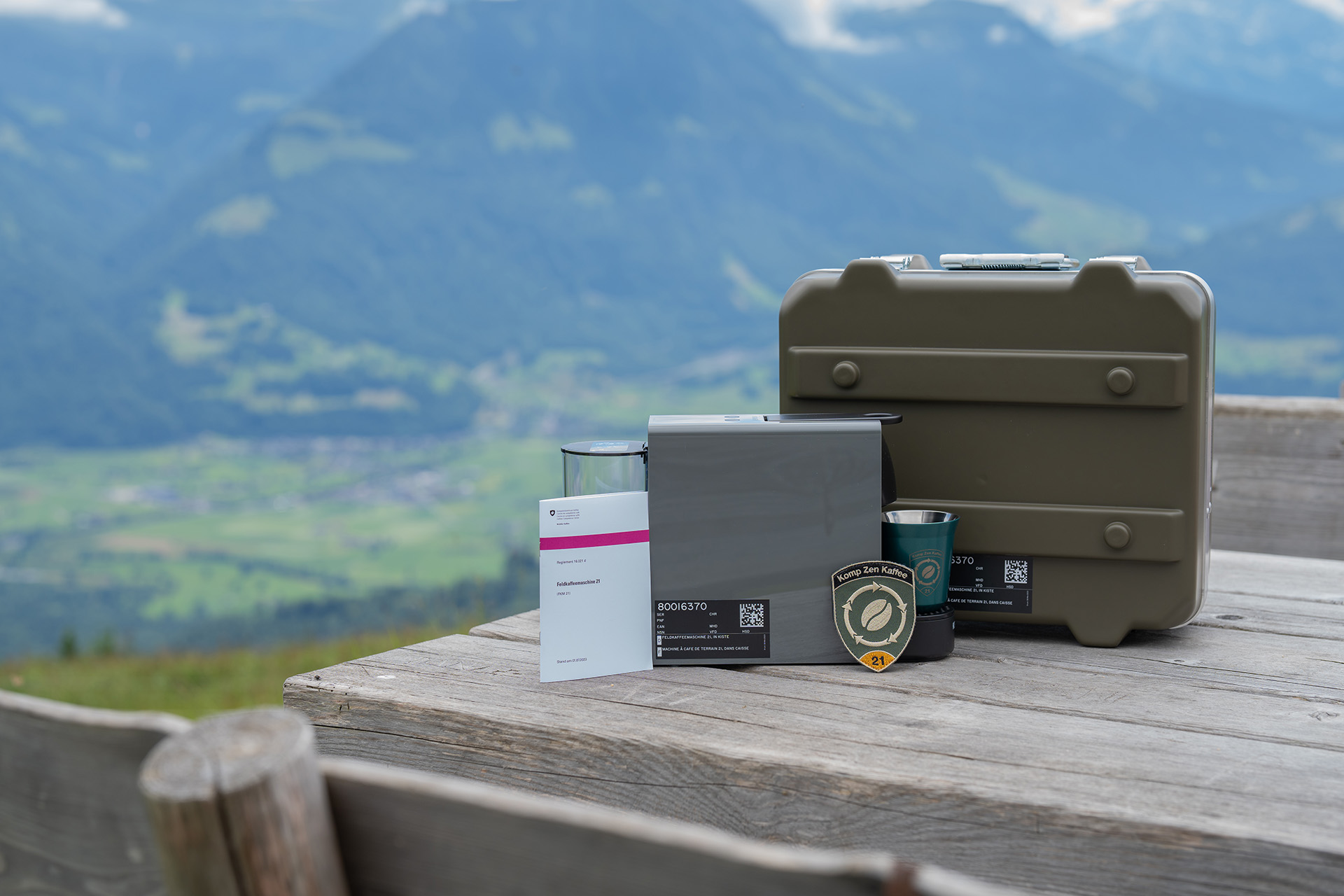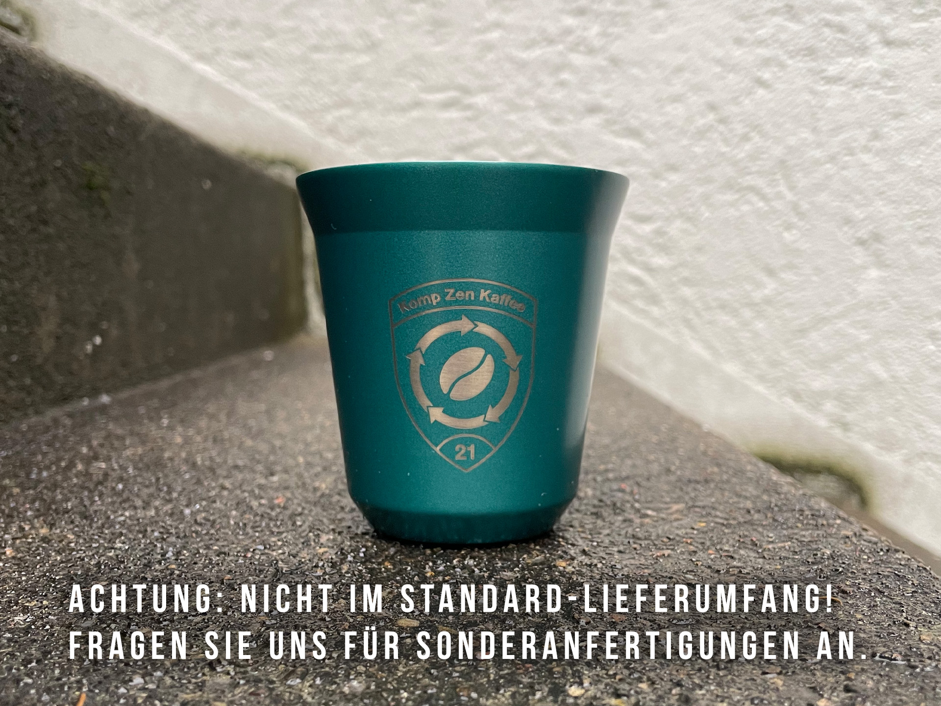 Als umweltfreundliche Alternative zu Pappbechern sind zwei hochwertige Aluminium-Kaffebecher in Feldgrün enthalten.